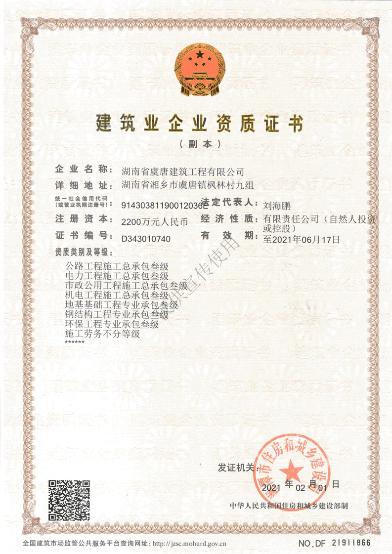 我公司具有建筑工程施工總承包貳級、消防設施工程專業(yè)承包貳級、建筑裝修裝飾專業(yè)承包壹級、特種工程(結構補強)專業(yè)承包不分等級、公路工程施工總承包叁級、電力工程施工總承包叁級、市政公用工程施工總承包叁級、機電工程施工總承包叁級、地基基礎工程專業(yè)承包叁級、 鋼結構專業(yè)承包叁級、環(huán)保工程專業(yè)工程承包叁級、承裝(修、試)電力設施四級、路面養(yǎng)護乙級資質、橋梁養(yǎng)護乙級資質、隧道養(yǎng)護乙級資質、交通安全設施養(yǎng)護乙級資質、施工勞務不分等級等多項施工資質。
