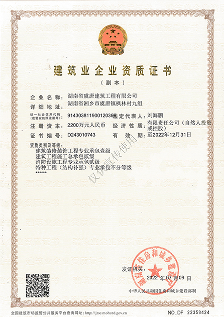 本公司具有建筑工程施工總承包貳級、消防設施工程專業(yè)承包貳級、建筑裝修裝飾專業(yè)承包壹級、特種工程(結構補強)專業(yè)承包不分等級、